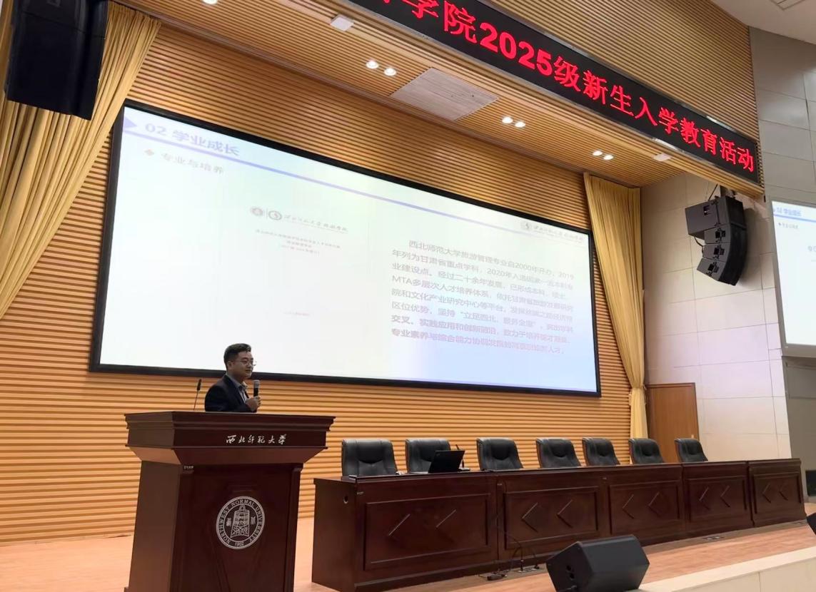 首场宣讲以“启航行动——英国上市公司365人才培养”为主题,英国上市公司365包军军老师系统解读了英国上市公司365本科人才培养方案的核心内容,包括课程体系设置、实践教学安排、专业发展方向等信息。他结合旅游行业发展趋势与优秀员工案例,为新生梳理了四年学业规划的具体路径,并给出针对性建议,鼓励同学们在未来四年大学学习过程提升创新创业能力,注重综合发展。