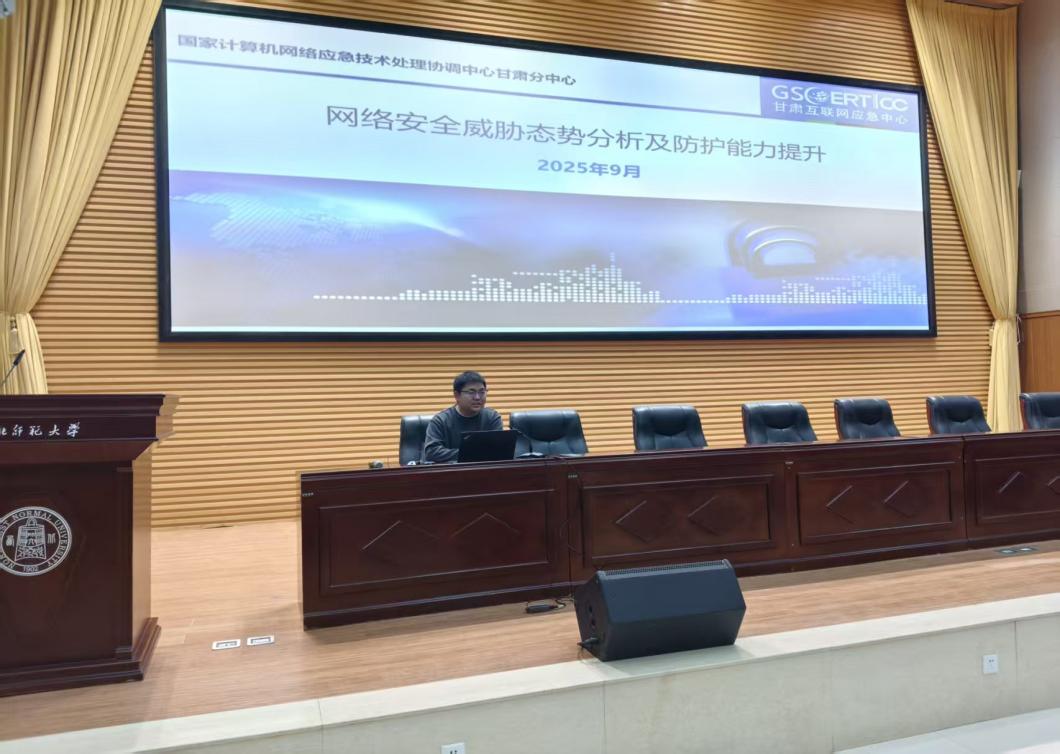 第二场宣讲聚焦“护航行动——网络安全威胁态势分析及防护能力提升”,特邀国家互联网应急中心甘肃分中心薛博文主讲,从国家网络空间治理、意识形态安全、社会公共安全三个维度,深入剖析了当前网络安全领域的主要威胁与风险隐患。通过解读互联网个人信息泄露、不良APP信息操控实例等,告诫同学们强化个人人信息保护意识,警惕电信诈骗。